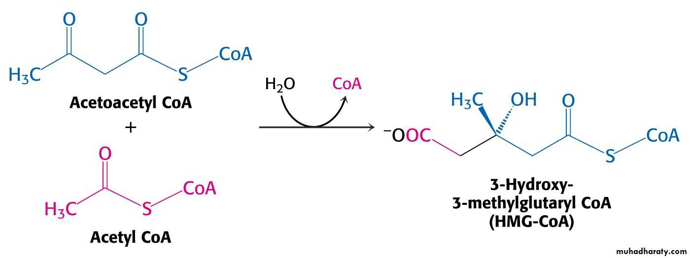 Acetoacetyl CoA reacts with acetyl CoA and water to give 3-hydroxy-3-methylglutaryl CoA (HMG-CoA) and CoA.