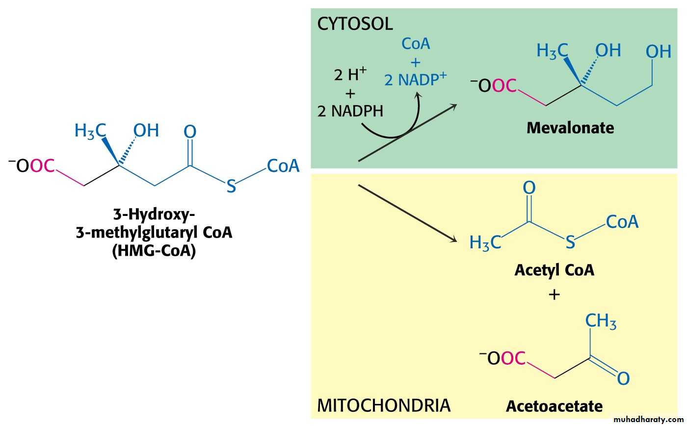 In mitochondria 3-Hydroxy-3-methylglutaryl CoA is cleaved to acetyl CoA and acetoacetate.Enzyme: HMG-CoA lyase.