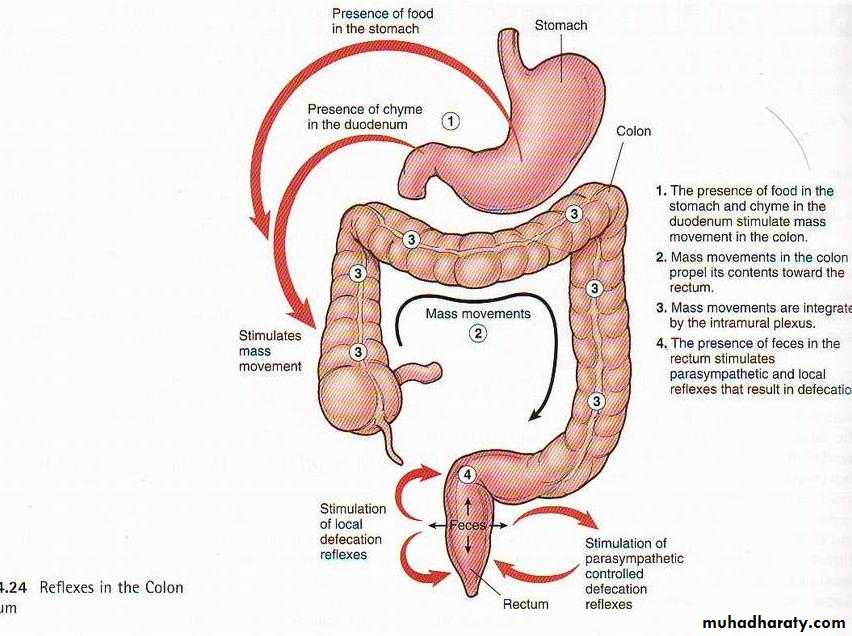 • Gastrocolic and Duodenocolic reflexes initiate mass movement, they result from distention of the stomach and duodenum, they are conducted through the extrinsic nerves when extrinsic nerves are removed, these reflexes do not occurs at all.• Irritation of the colon can initiate intense mass movement. In (ulcerative colitis) mass movement persist all the time.
