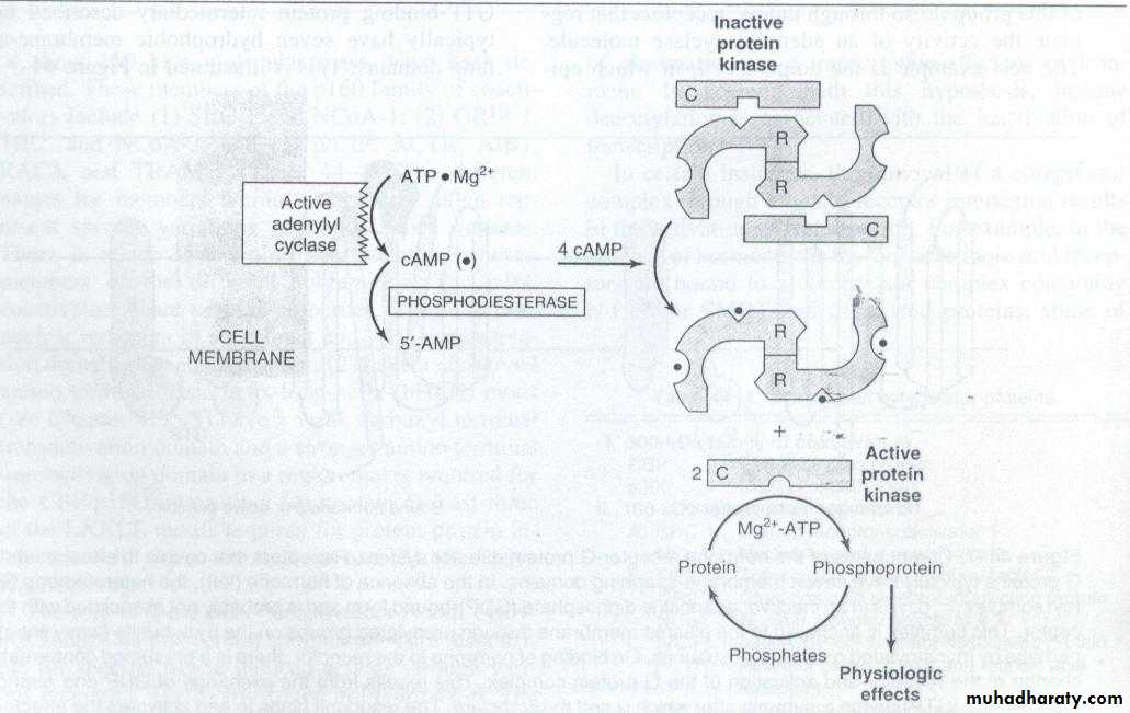In eukaryotic cells, 4 molecules of c-AMP bind to a specific “protein kinase” which is responsible for protein phosphorylation. This binding activates this protein kinase and the active protein kinase will utilize an ATP molecule in the presence of Mg+2 to convert proteins to phosphoproteins which would then exert their biological effects. Actions caused by hormones that increase c-AMP concentration can be terminated by phosphodiesterases. These hydrolytic enzymes insure a rapid turnover of the signal (c- AMP) and hence rapid termination of the biological process.
