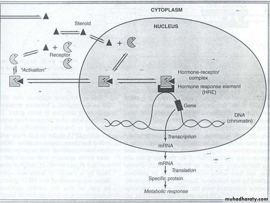 When a hormone of group I is carried till the cell surface membrane, it diffuses within the membrane by its lipophilic property, but ultimately binds to its specific, high affinity receptor whether in the nucleus or in the cytoplasm. The hormone- receptor complex undergoes a temperature and salt dependent “ Activation reaction” that results in size , confirmation and surface- charge changes that enable the complex to bind to a specific region of the DNA called Hormone Response Element (HRE).
