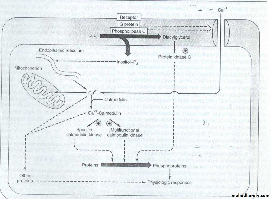 When the cell surface receptors are occupied by their specific hormones such as ADH, Acetylcholine or 1- cathecholamines; they become potent activators for (Phospholipase- C) enzyme which is an enzyme in the plasma membrane of the target cell. Activation of phospholipase -C is accompanied by the effect of a unique protein (G- protein) which would together result in increased Ca+2 influx to the intracellular space on one hand, and to the hydrolysis of [ Phosphatidyl inositol biphosphate or PIP-2] into (diacyl glycerol) and (inositol triphosphate or IP- 3) on the other hand.