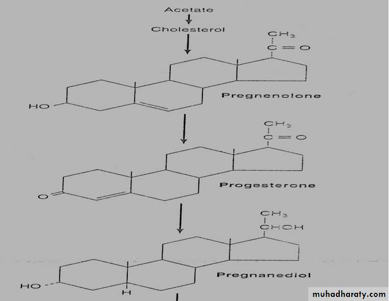 A. Estrogens : the liver converts estradiol and esterone to estriol so the E2,E1,E3 are substrates for hepatic enzymes that add glucuronide or sulfate moieties then the conjugated steroids are water soluble and don’t bind to transport proteins, so excreted in bile ,feces and urine. B. Progestins: they are also metabolized by liver to several compounds and excreted in the urine as "sodium-pregnanediol 20- glucuronide". So it is ineffective when given orally, other derivatives of 17-alpha hydroxy- progesterone and 17alpha -alkyl-substituted 19-nortestosterone compounds have progestins activity and avoid hepatic metabolism so can be used as contraceptive drugs.BIOSYNTHESIS OF PROGESTERONE