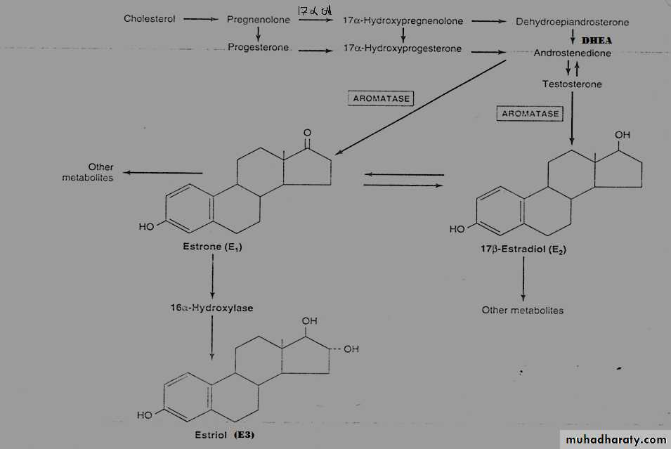 The estrogens are a family of hormones synthesized in a variety of tissues, 17 –β Estradiol is the primary estrogen of ovarian origin. Estrogens are formed by the aromatization of androgens in a complex process that involves 3 hydroxylation steps each of which requires O2 and NADPH. The aromatase enzyme is thought to include a P450 mixed- function oxidase.Estradiol is formed if the substrate of this enzyme complex is TT, whereas esterone results from the aromatization of androstenedione.