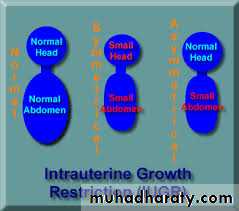 Symmetrically small fetuses are associated with factors that directly impair fetal growth, such as chromosomal disorders and fetal infections.Asymmetrical growth restriction is classically associated with which leads to reduced oxygen transfer to the fetus and impaired excretion of carbon dioxide by the placenta. A fall in PO2 and a rise in pCO2 in the fetal blood induces a chemoreceptor response in the fetal carotid bodies with resulting vasodilatation in the fetal brain, myocardium and adrenal glands, and vasoconstriction in the kidneys, splanchnic vessels, limbs and subcutaneous tissues. The liver circulation is also severely reduced