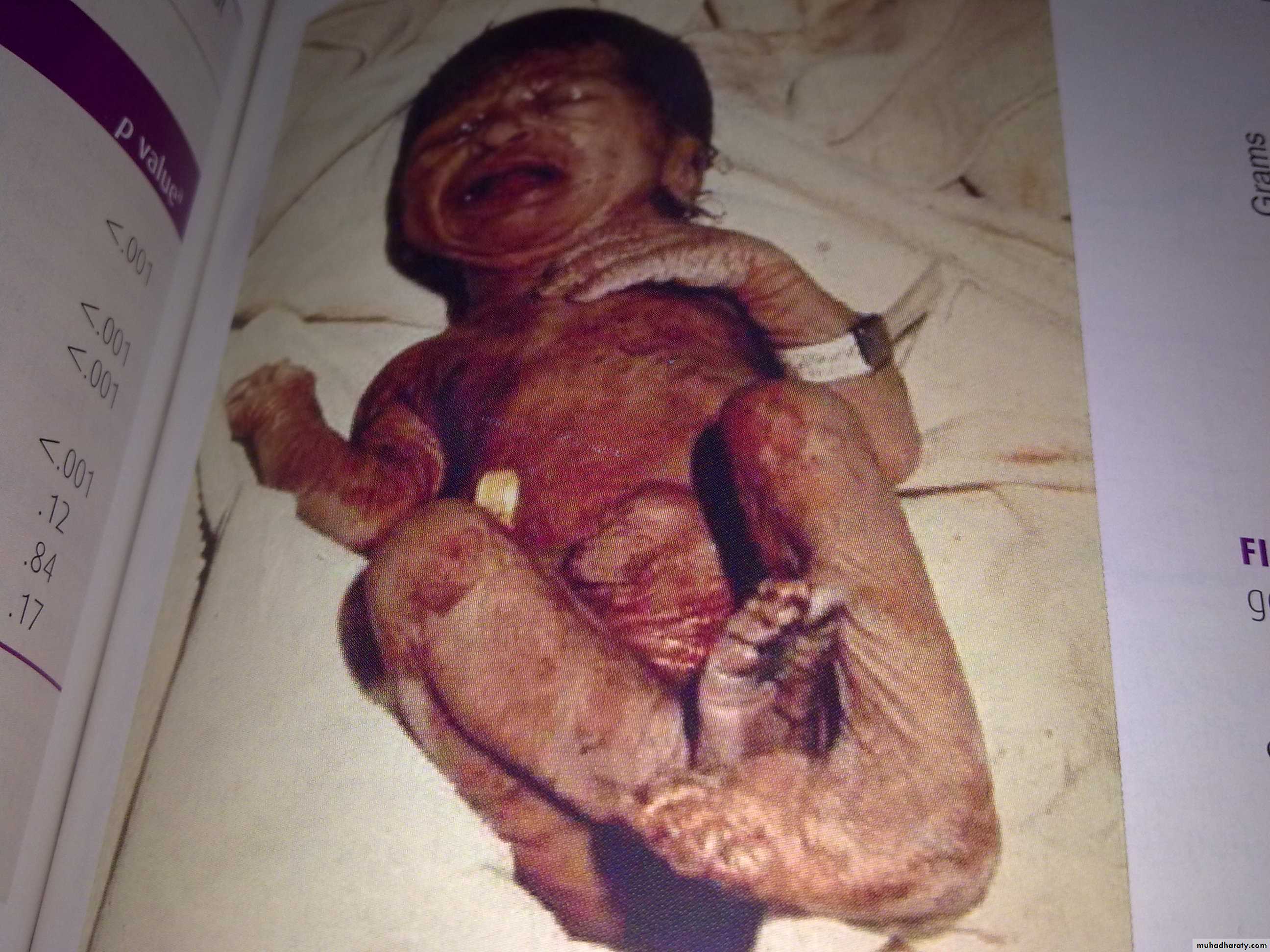 1-Postmaturity(dysmaturity) syndrome :Occuring in 20-30% of post term infants present a unique & characterstic appearance which includes wrinkled (prominent in palms &soles) ,patchy peeling skin ,long nails ,a long ,thin body suggesting wasting &advanced maturity because the infant is open- eyed allert warry appearance.