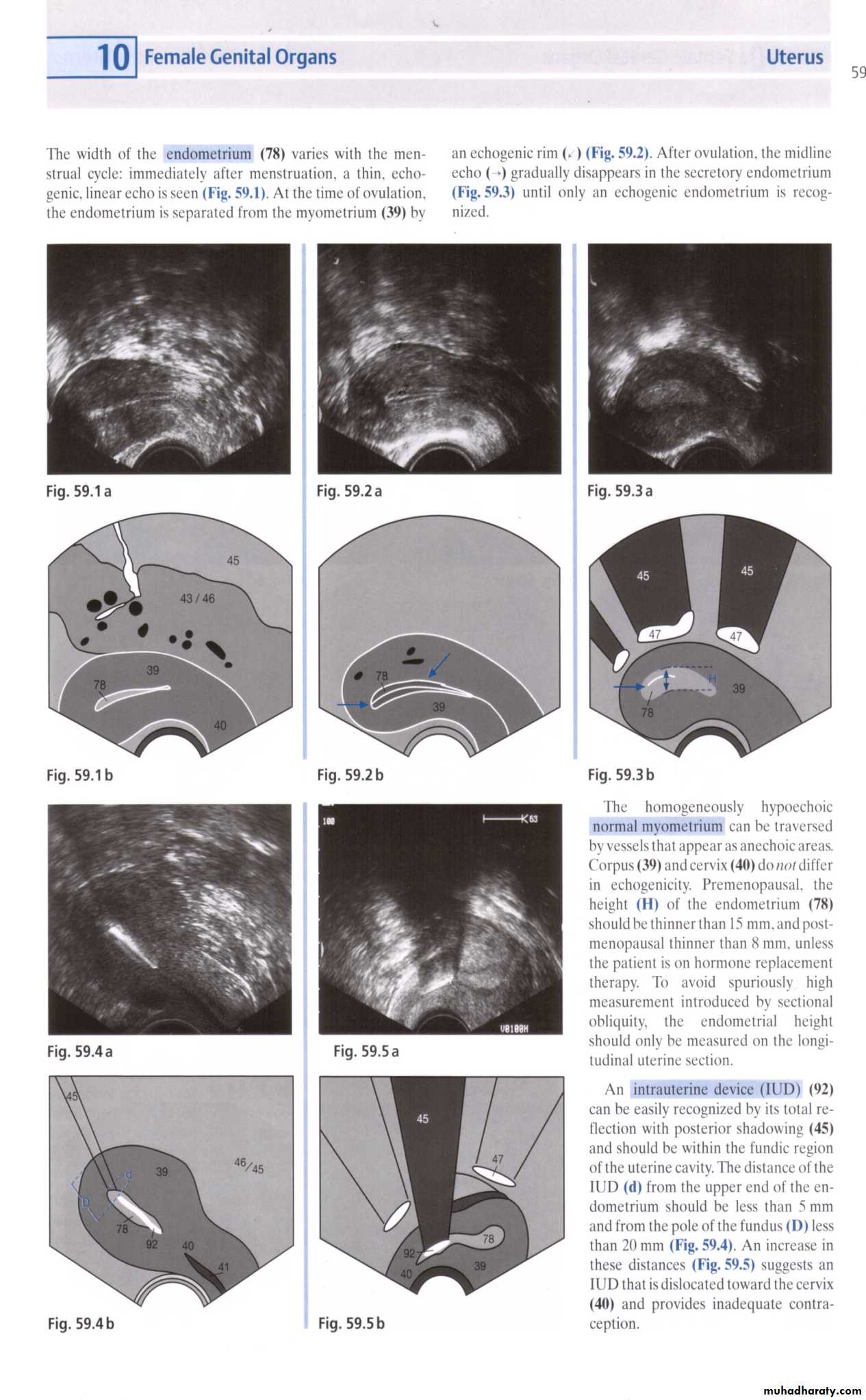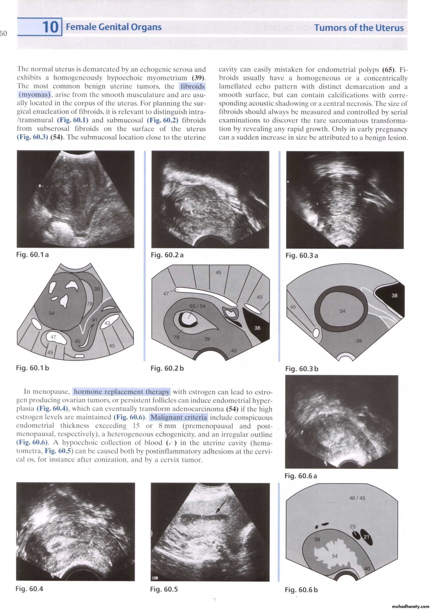 Fibroid are easily identified as discrete circular structure a rising in the myometrium.The position (subserous,intramural,submucos,cervical) and the size of fibroid can be Documented.