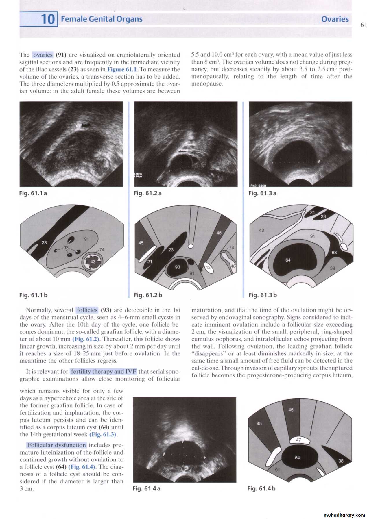 are identified as lozenge shaped structure lateral to the uterus usually related to the internal iliac veins . early in the cycle several follicles of about 5 mm in diameters can be identified but after day 8 a dominant follicle can be seen in one of the ovaries and it’s growth can be tracked
