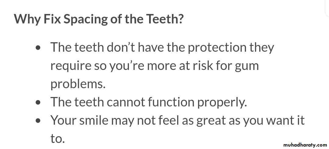 is a dental anomaly characterized by interdental spaces and lack of contact points between teeth. When spacing concerns both anterior and posterior teeth it is generalized, in contrast to localized spacing when only two or four teeth are involved. The aim of this study is to describe spacing in the deciduous and permanent dentitions, present the etiologic factors leading to this condition and indicate possible therapeutic approaches and specific treatment features depending on the cause.The causes of generalized spacing may be hereditary, acquired or even functional. The most important ones are tooth size – alveolar arch size discrepancies, large teeth, incorrect tongue position and function, and congenitally missing teeth. Localized spacing is usually due to several local factors, such as missing, supernumerary or small teeth, over-retained primary teeth, sucking habits, periodontal disease and hypertrophic upper lip frenum.Orthodontics plays an important role in the management of tooth spacing, often in cooperation with other dental specialties, such as periodontology, esthetic dentistry, prosthodontics or even maxillofacial surgery. The most appropriate time for treating this condition is usually the permanent dentition period. Treatment is individualized and directly related to etiology; it is performed mainly for esthetic and psychological purposes.