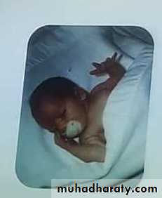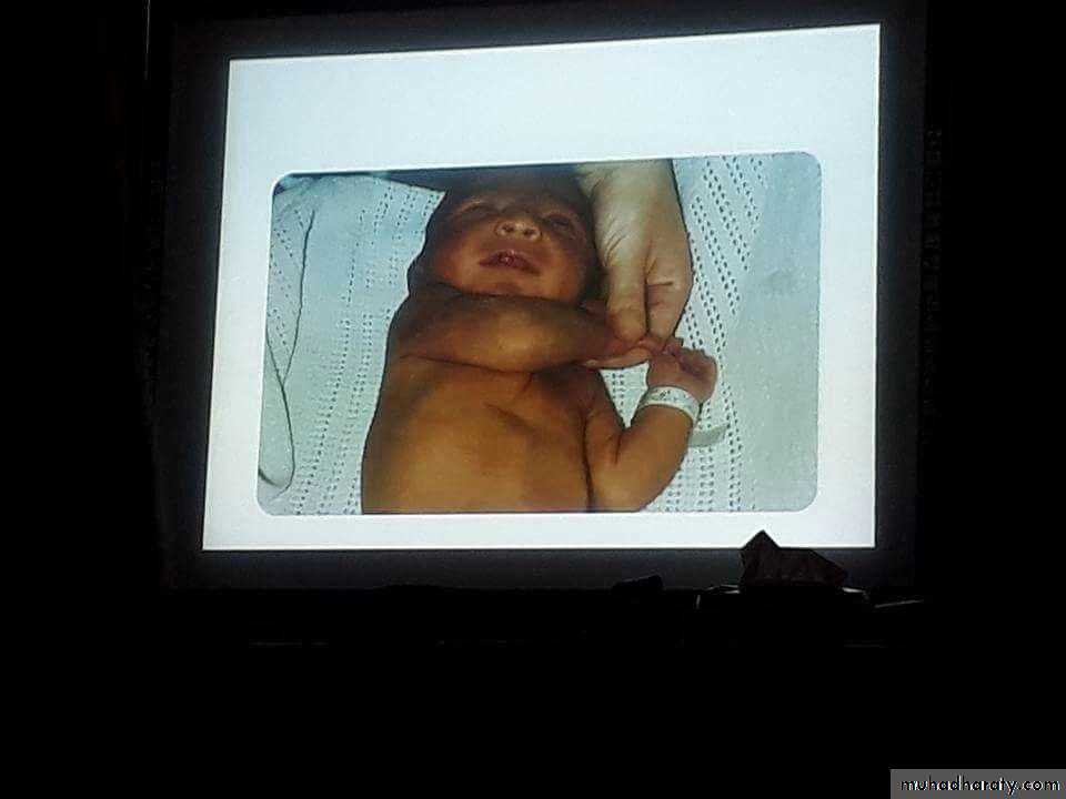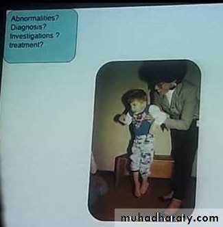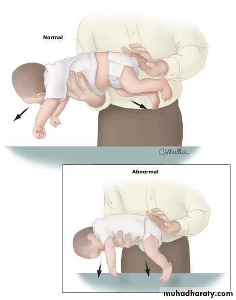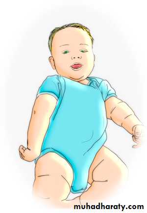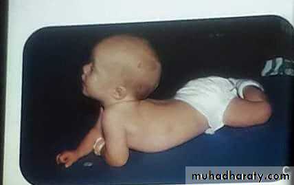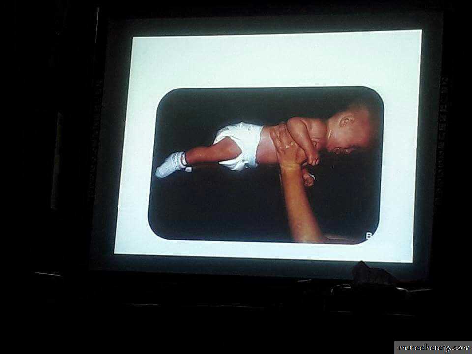 Autosomal dominantInverted u shape ventral suspention , floppy baby if > 5 months its abnormal