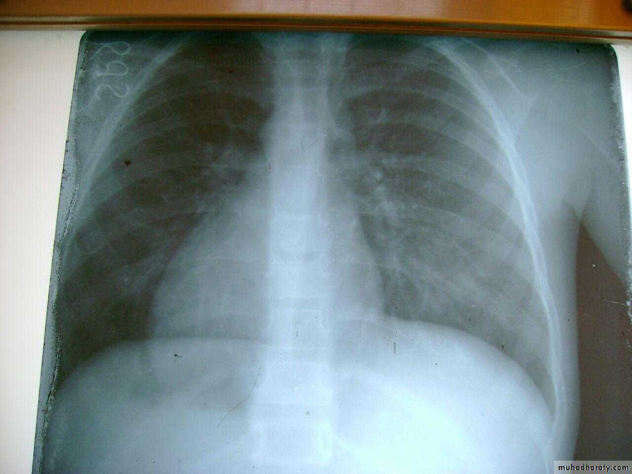 Enlarged hilar lymph nodes + non hemogenous opacity of middle and lower lobe