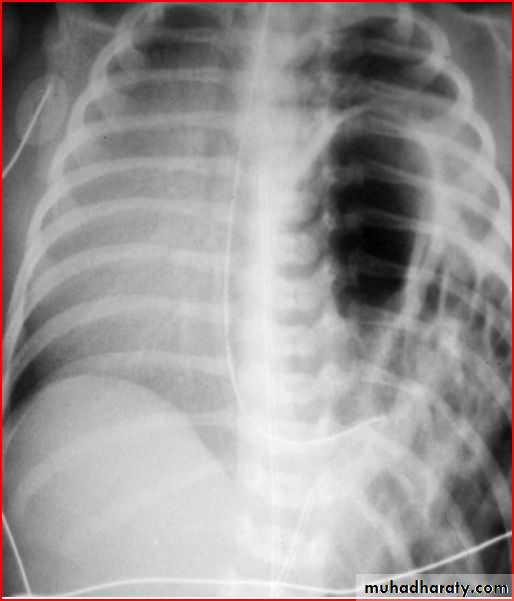 Rt. Diaphragmatic hernia (rare) + pneumothorax in lt. due to lung hypoplasia