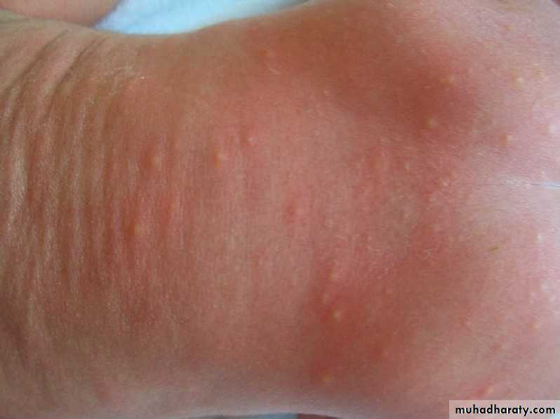 Appear after 1st day , red raised , eosinophils