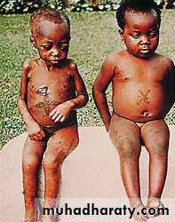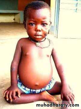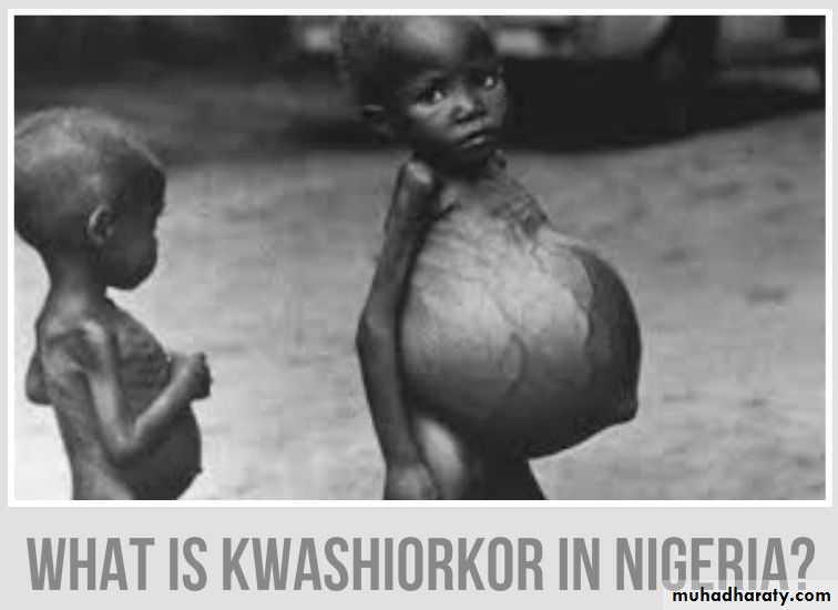 Kwashiorkor is a form of severe protein–energy malnutrition characterized by edema, irritability, ulcerating dermatoses, and an enlarged liver with fatty infiltrates. Sufficient calorie intake, but with insufficient protein consumption, distinguishes it from marasmus. Kwashiorkor cases occur in areas of famine or poor food supply.