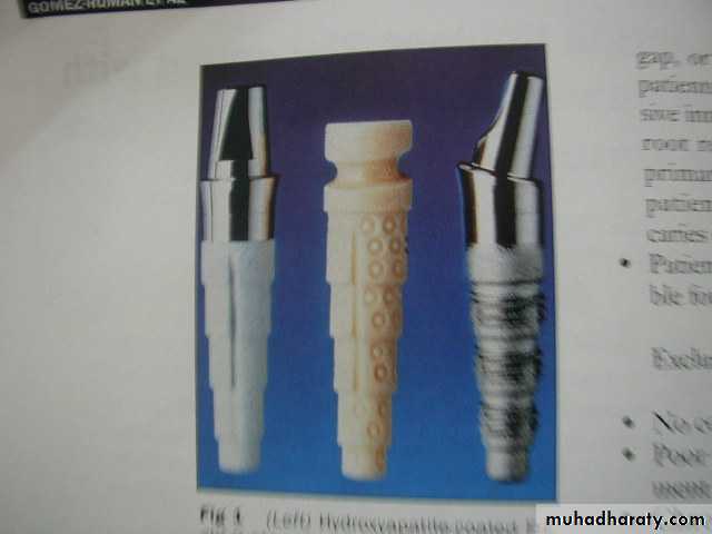 Fixture – implant component that engages the bone.( threaded ,grooved ,perforated ,plasma sprayed , or coated.)Transmucosal abutment – provides connection between implant fixture and prosthesis.