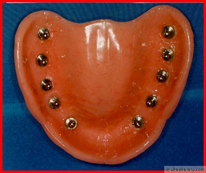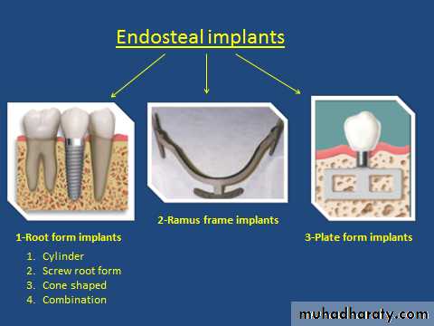 Epiosteal / Subperiosteal implants: which rests upon the bony ridge but does not penetrate it.Endosteal / endosseous implant: Most commonly used which is placed into the alveolar bone/basal bone of maxilla or mandible.
