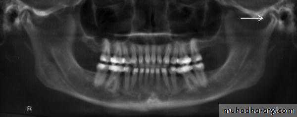 May be asymptomatic or patients may have symptoms of TMJ dysfunction (pain, limited mandibular opening, mandibular deviation and swelling)* Radiographic Features: