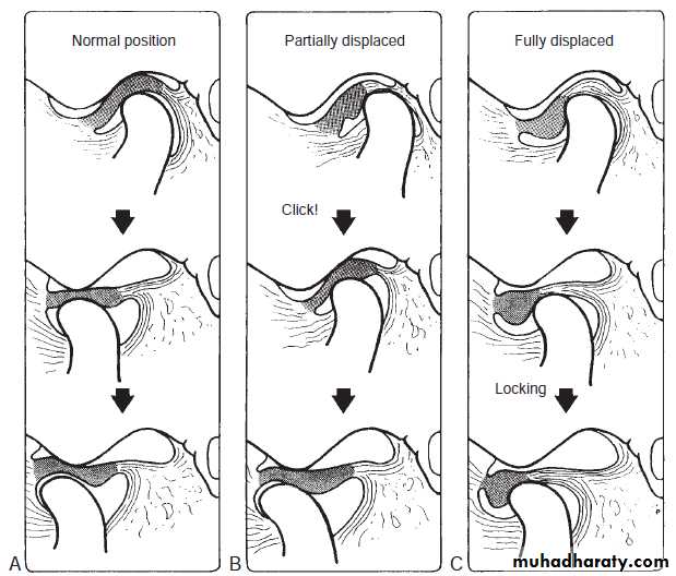 Normal position (A), mildly displaced anteriorly (with reduction , B ), and severely displaced anteriorly (without reduction, C ).Symptoms include: