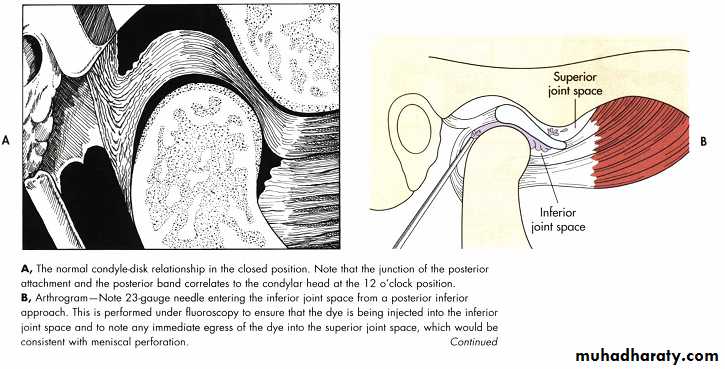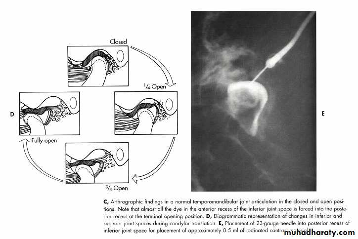 Arthrography ( injecting water soluble, iodinated contrast material into the inferior joint space under fluoroscopy, to show various stages of disk displacement with or with out reduction by a videotaped arthrofluoroscopic)