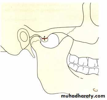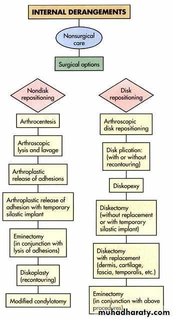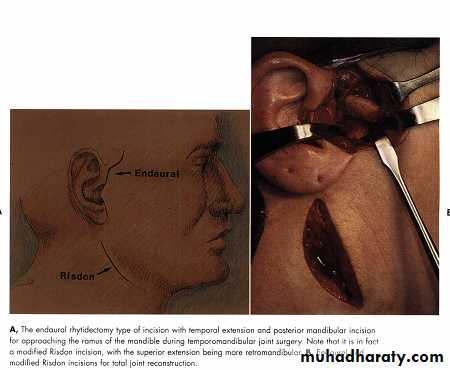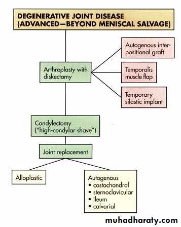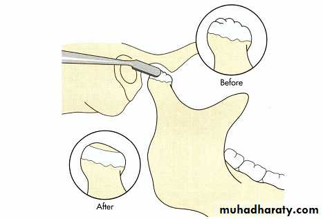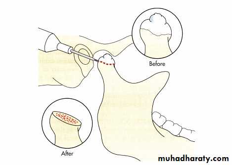High condylar shave. A 1-mm fissure bur is used to remove a 3- to 4-mm section of the anterior-superior slope of the condyle. The cortical edges are then smoothed with a bone file. This maneuver often exposes underlying morrow in the condylar head and leads to progressive sclerosis and degeneration. (This procedure, in widespread use in the 1970s and early 1980s, involved a 2· to 4·mm resection of the anterior· superior slope of condyles that exhibited signs of degeneration, including sclerosis, breaking, subchondrol cysts, and osteophytes.