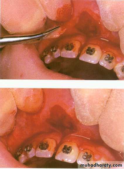 Upper labial frenectomy aims to remove or reposition the entire labial frenum, including its attachment to bone, and to remove all interdental tissue. It must be remembered that spacing of the incisors in children is a normal developmental process and is present until the eruption of the permanent canine teeth in adolescents.Labial frenectomy should usually be delayed until after orthodontic treatment, unless the labial frenum prevents closure of a diastema or displays evidence of trauma. The technique is usually performed if the frenum extends to the incisive papilla and contributes to post-treatment stability of the orthodontically closed diastema.