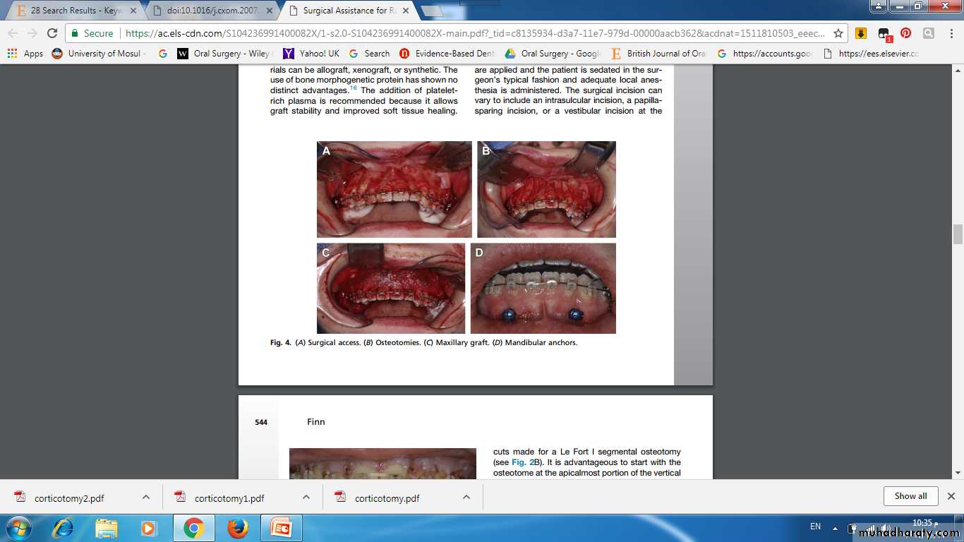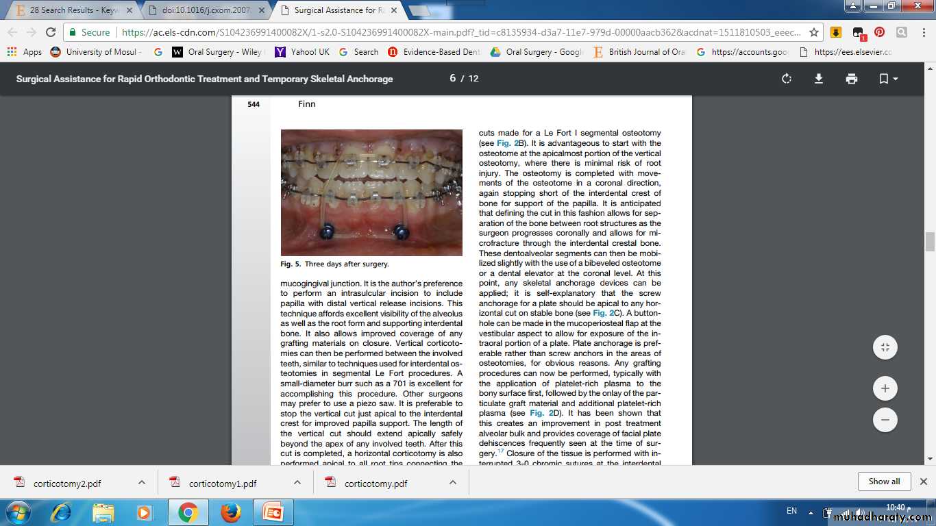 After elevating a mucoperiosteal flap, a series of vertical corticotomies are made in the labial and palatal compact bone around teeth to be moved. The apical ends of these cuts are joined by horizontal cuts, leaving the teeth supported by cancellous bone only. Bone chips or bone substitutes can be used to fill the gaps. After closure, strong orthodontic pressure, usually by traction elastics, is applied. A retainer should be worn for few days postoperatively.• Surgical access.