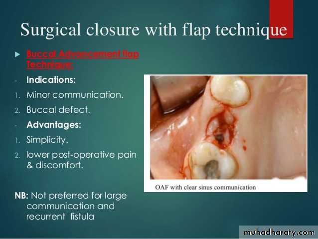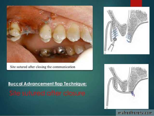 • After that closure of wound: The mucoperiosteal flap is sutured into position across fistula with interrupted sutures.