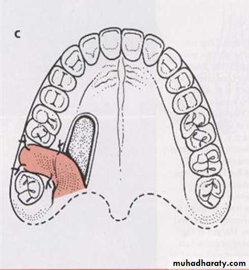 • Palatal flap is rotated across fistula so that the suture line rests on sound bone on buccal side of the orifice.