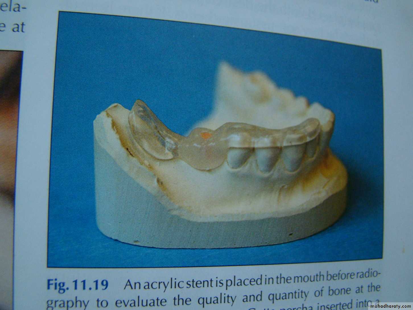 Once the position of the implants is determined by clinical, radiographical, and diagnostic cast examinations, a surgical stent is then fabricated.The surgical stent should seat on the occlusal surfaces of the remaining dentition, and the ridge should be clearly visible through the occlusal surfaces where the wax-up has been removed.