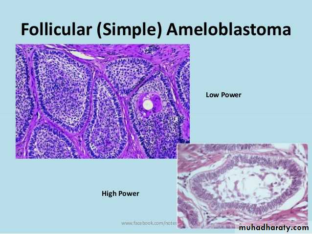 A benign but locally invasive polymorphic neoplasm consisting of proliferating odontogenic epithelium which usually has a follicular or plexiform pattern, lying in a fibrous stroma. Most often a central tumour of jaw bones although peripheral variants are occasionally seen