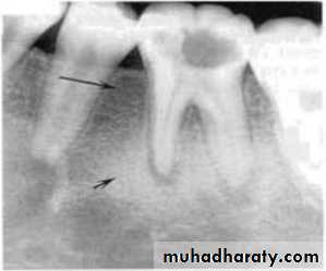 Blending border. A gradual transition from the dense trabecular of sclerosing osteitis (short arrow) to the normal trabecular pattern (long arrow).