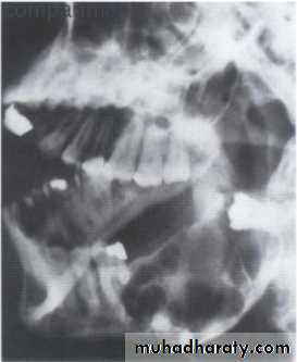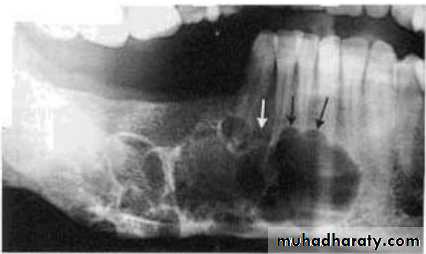 • Larger and less numerous loculations due to breakdown of honeycomb pattern eg.ameloblastoma.