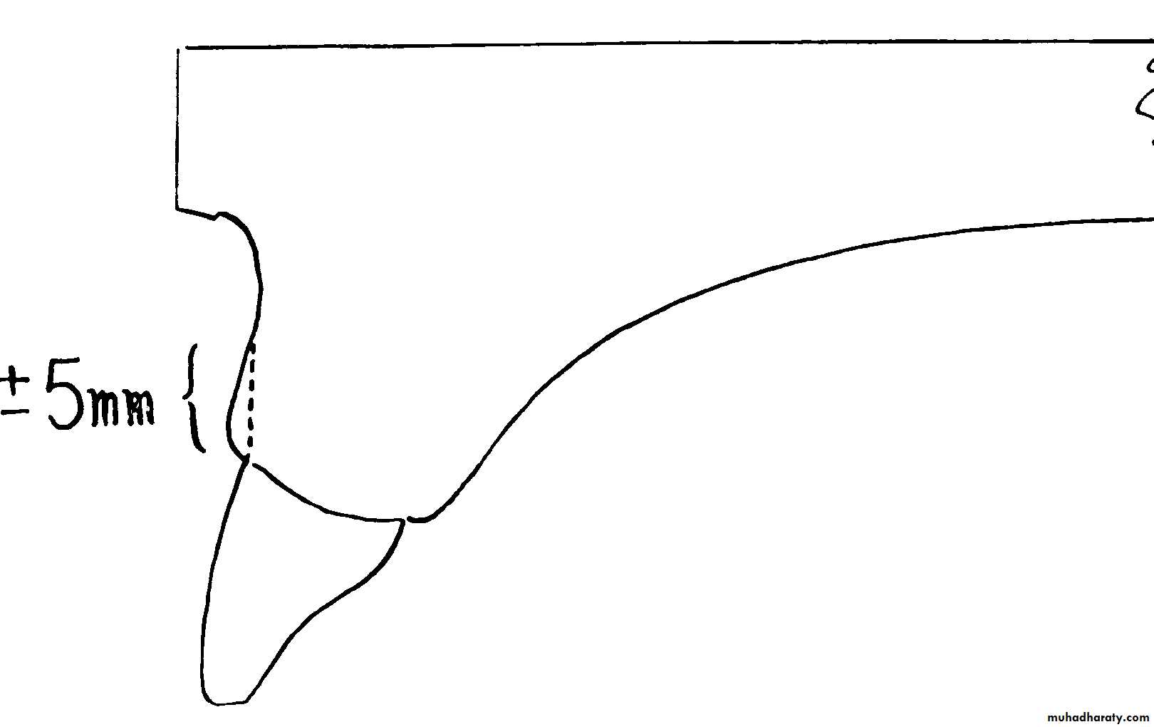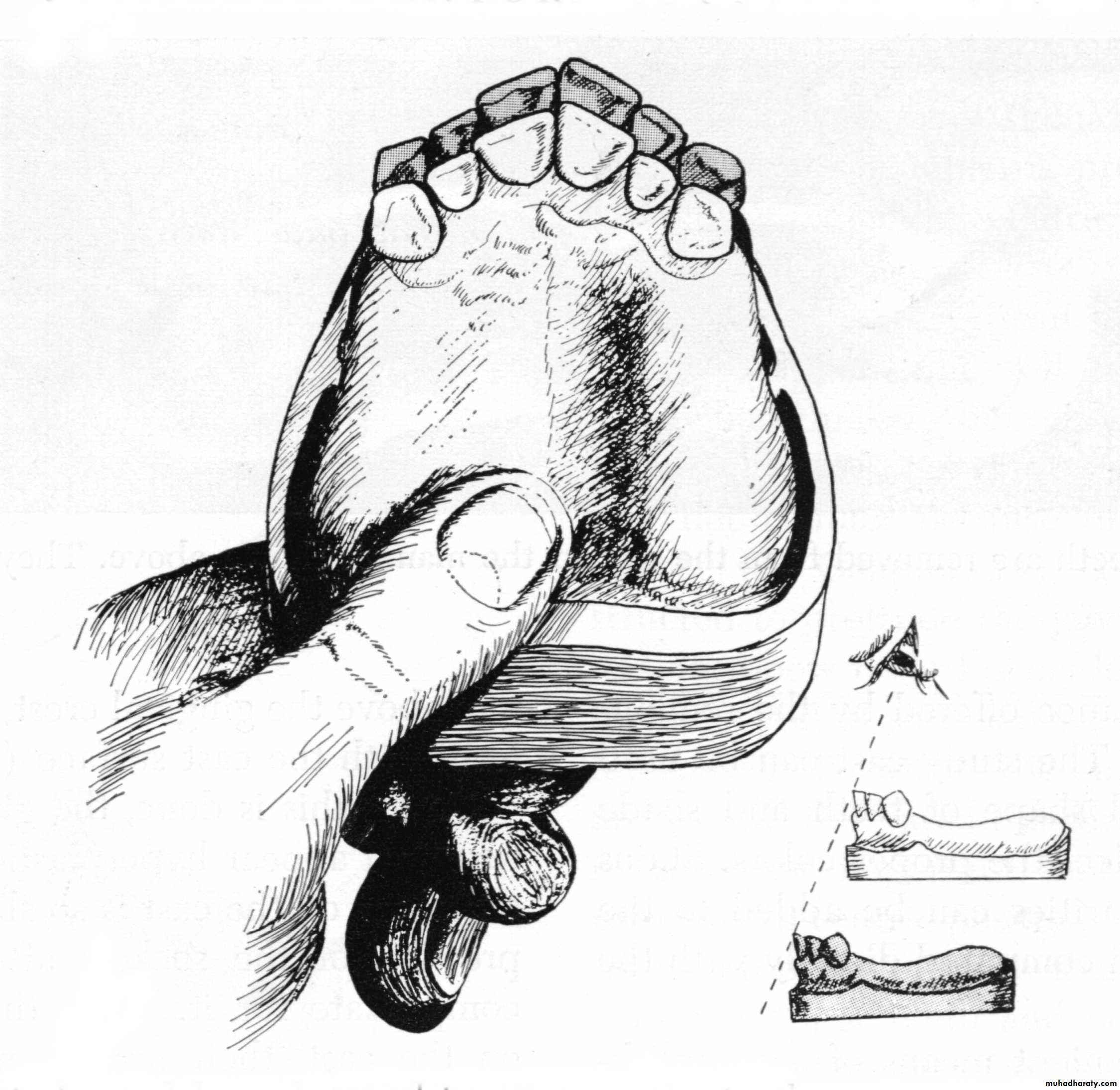 The terminal 5 mm of gingiva should be trimmed in the manner shown above so that the denture gingiva may not appear too thick.