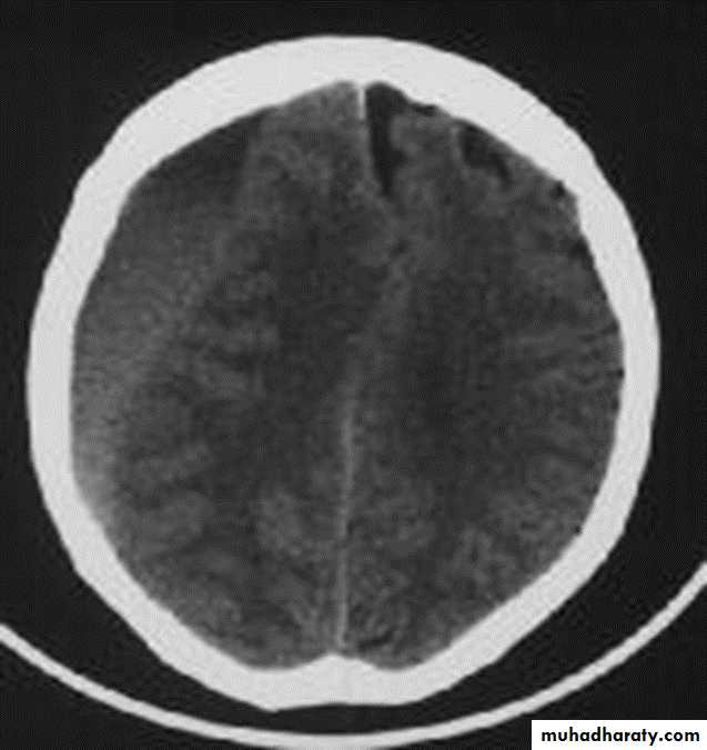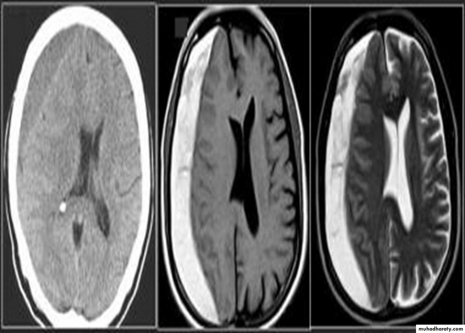 Mostly occurs in those over 50 years old,½ of patients have got no history of trauma (If there is any history of trauma then it is trivial), Alcoholism, epilepsy, coagulopathy are common, Dementia is common presentation. The treatment is medical In minimal neuological deficit. If not successful or with deterioration of neurological picture so surgery is the role by burr hole evacuation.( the CT picture is hpodense crescent exraaxial mass)Extradural hematomas
