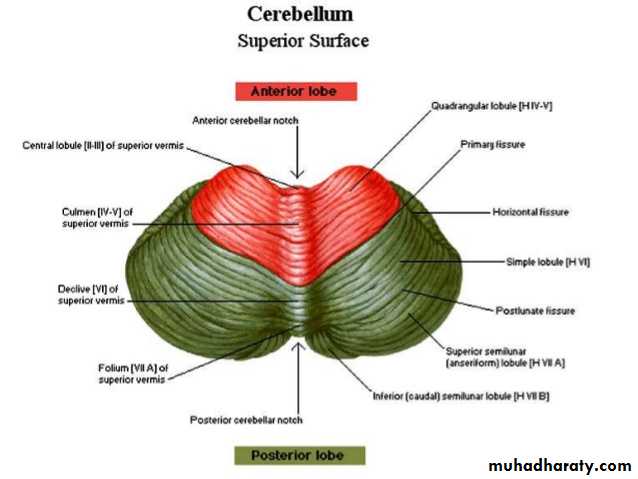 The cerebellum fine-tunes and coordinates movements initiated by the motor cortex including speech.A lesion in a cerebellar hemisphere causes lack of coordination on the same side of the body.