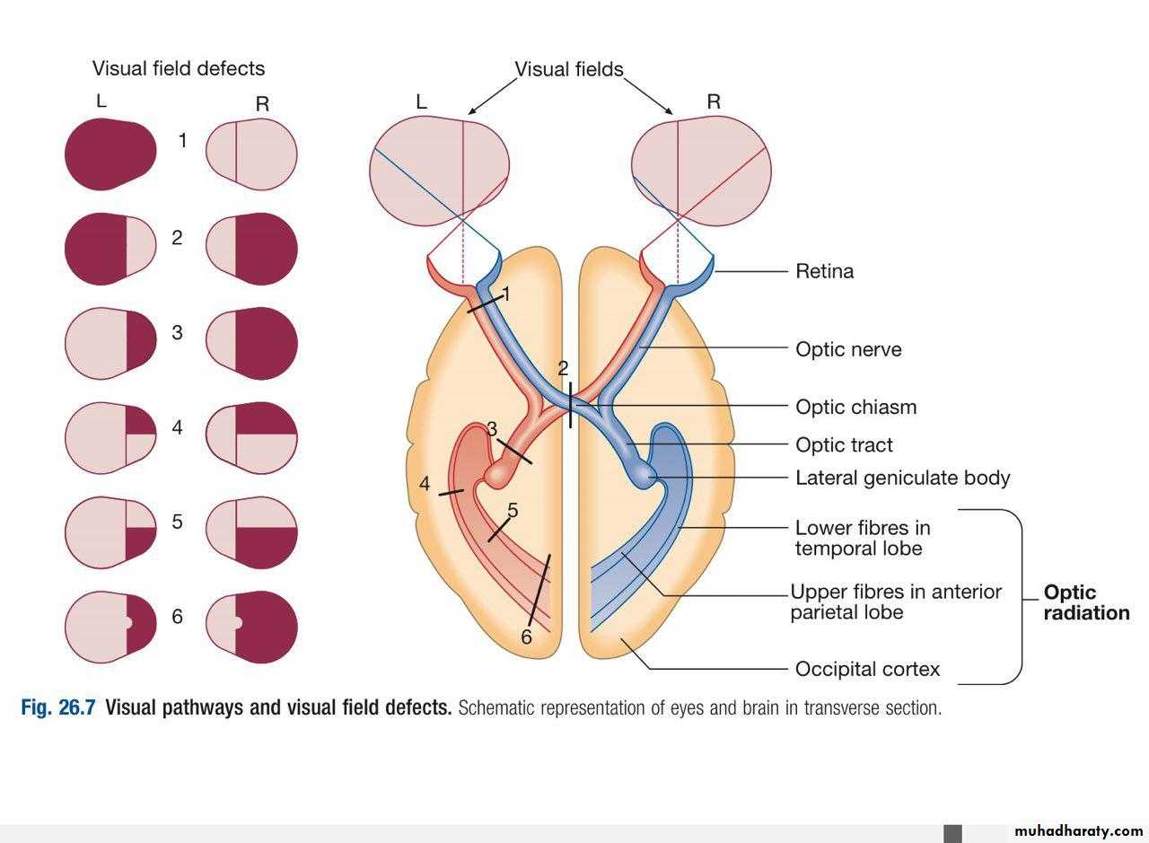 visual pathways start by Fibers from ganglion cells in the retina pass to the optic disc and then backwards through to the optic nerve.Nasal optic nerve fibers (subserving the temporal visual field) cross at the chiasm, but temporal fibers do not. Hence, fibers in each optic tract and further posteriorly carry representation of contralateral visual space.