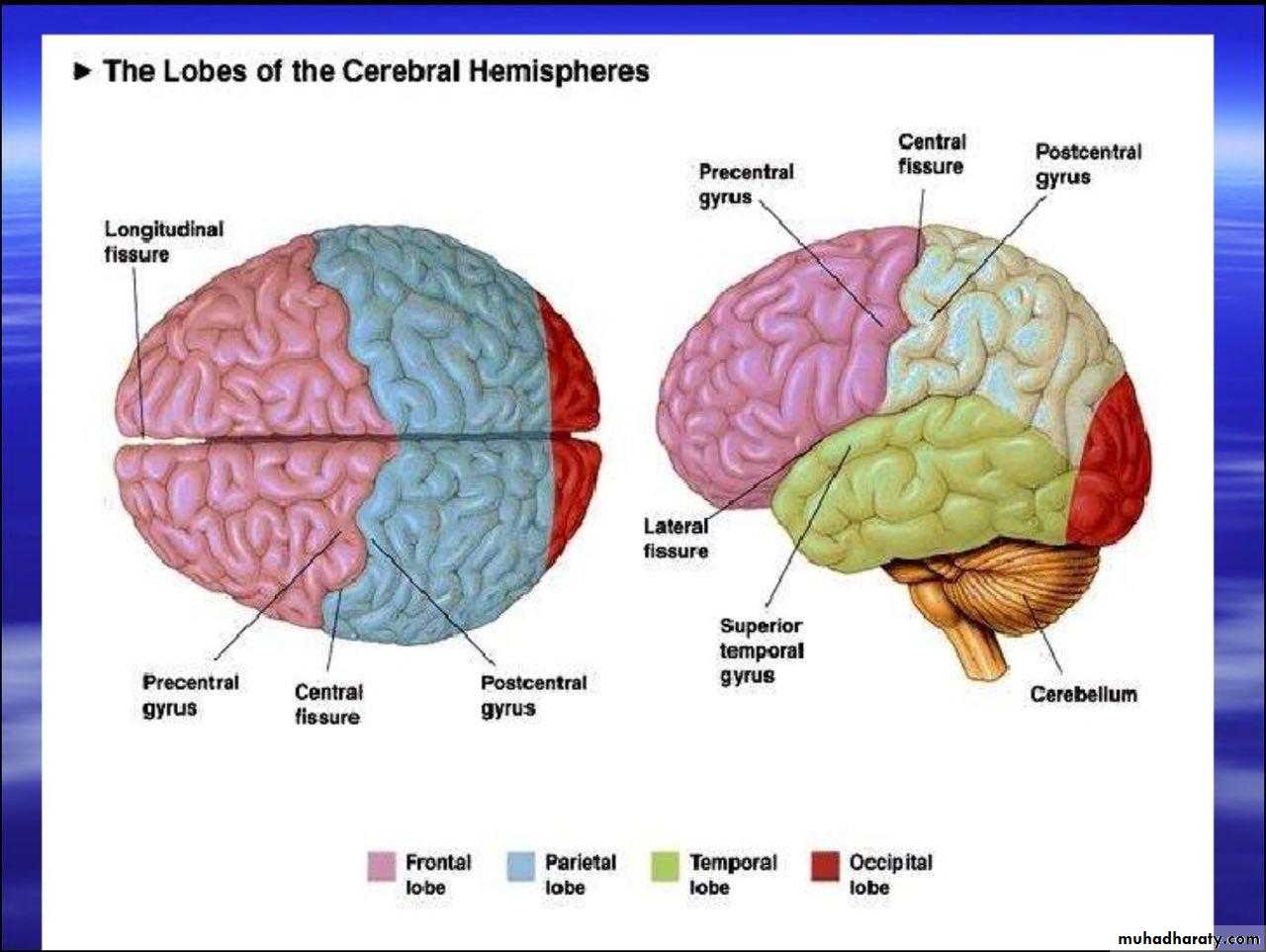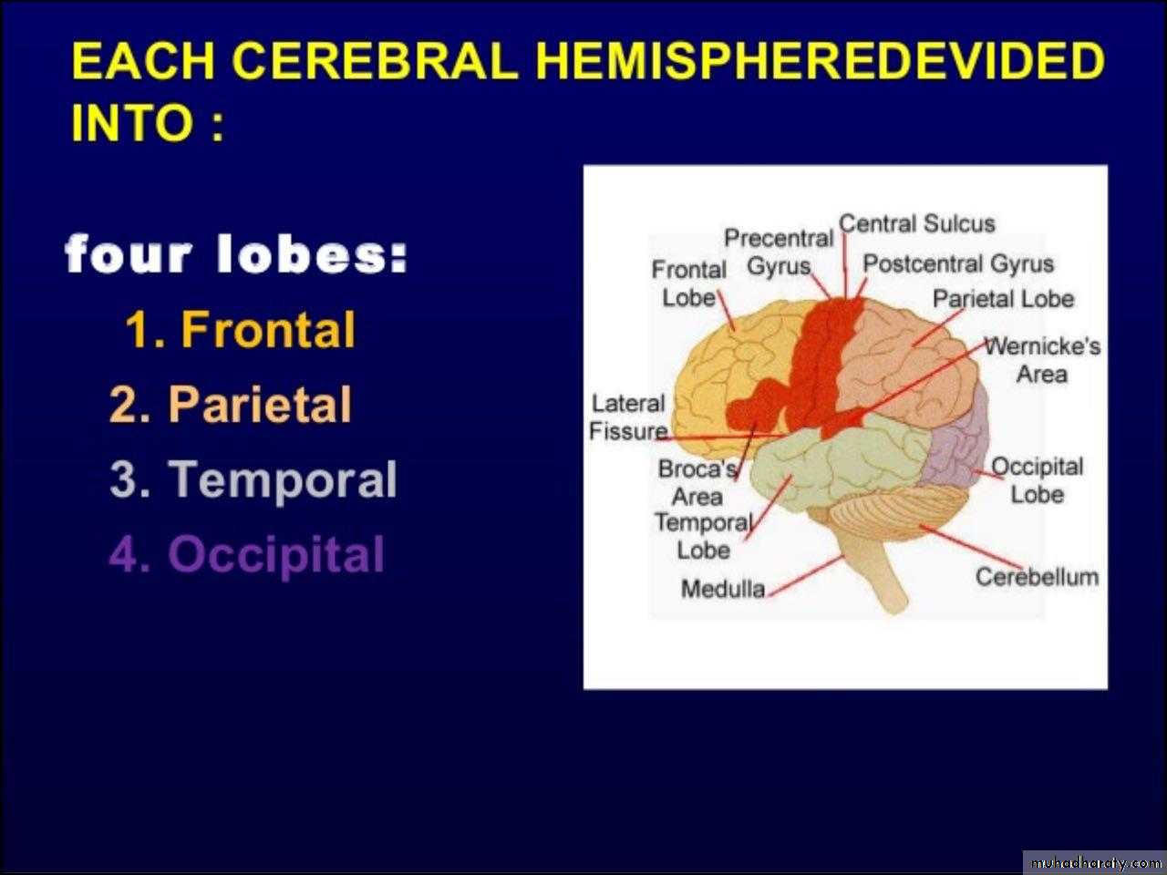 Each cerebral hemisphere has four functionally specialised lobes but some functions are lateralized, and this depends on cerebral dominance (i.e. the hemisphere in which language is represented).