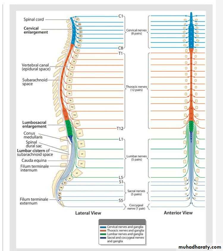 There are 31 spinal cord segments (eight cervical, twelve thoracic, five lumbar, five sacral, and one coccygeal.each segment has a pair of dorsal (sensory) and ventral (motor) roots that join to form a mixed spinal nerve just as they enter the dural sleeve and neural foramina