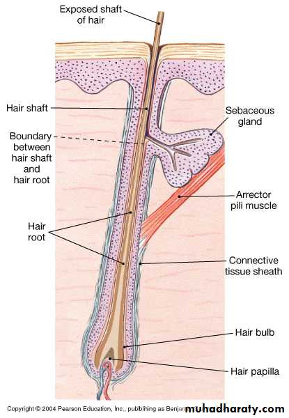 A bundle of smooth muscle, the arrector pili,extends at an angle between
