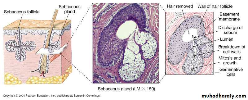 Holocrine type of secretion: degeneration of the whole gland after it is filled & release of sebum