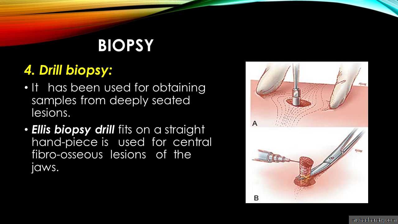 Biopcy: it’s a medical test commonly performed by a surgeon, interventional radiologist or an interventional cardiologist. involving removal of sample cells or tissues for examination under microscope to determine the presence or extent of disease.different techniques are used in clinical practice to obtaia specimen of tissue for biopsy purposes which are :