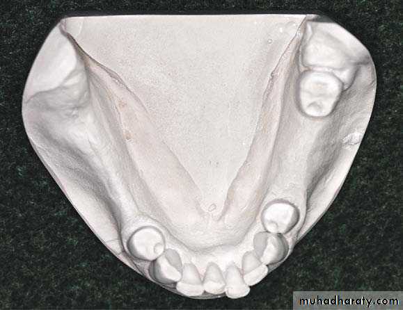 more pronounced posteriorly than anteriorly, and it produces a broader mandibular arch while constricting the maxillary arch.