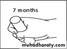 Adaptive: Reaches out for and grasps large object; transfers objects from hand to hand; grasp uses radial palm