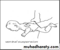 Prone: Legs more extended; head lifted momentarily to plane of body on ventral suspensionSupine: Tonic neck posture; head lags when pulled to sitting position