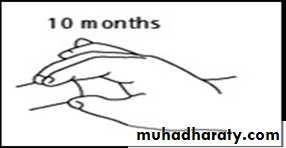 Motor: Walks with one hand held; rises independently, takes several stepsAdaptive: Picks up raisin with unassisted pincer movement of forefinger and thumb; releases object to other person on request.