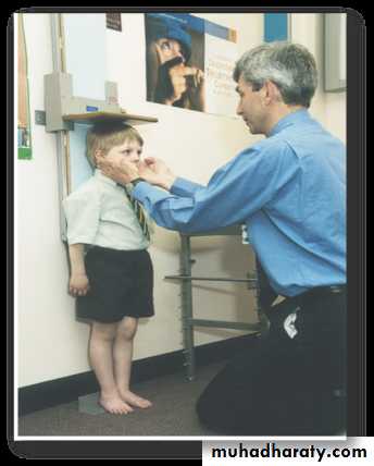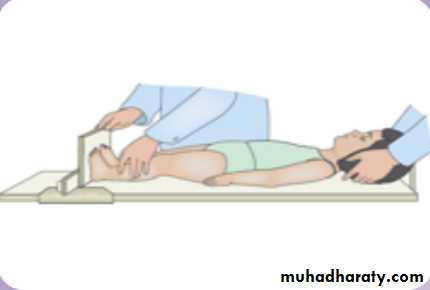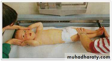 For infants, the measure of linear growth is length, taken by two examiners (one to position the child) with the child supine on a measuring board.