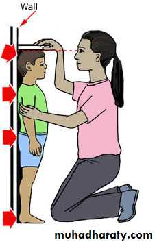 The child should stand erect with bare and closed feet , the external auditory meatus at the level of lateral canthus and all aspects of back should be in touch with the wall as much as possible.