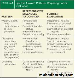 Deviations in growth patterns may be nonspecific but may be important indicators of serious and chronic medical disorders. An accurate measurement of height, weight, and head circumference should be obtained at every health supervision visit. The following summarizes several convenient benchmarks to evaluate normal growth