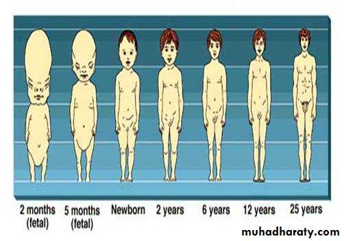 BODY PROPORTIONS:Body proportions follow a predictable sequence of changes with development. The head and trunk are relatively large at birth, with progressive lengthening of the limbs throughout development, particularly during puberty.