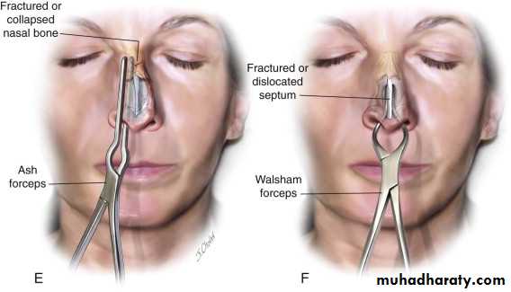 Closed Reduction is the treatment of choice for most nasal bone and/or septal fracture, these fractures should be repaired within 7 to 10 days, can be done under LA with or without sedation or GA.Use of left and right Walshm`s forceps to manipulate nasal bone at frontal process of maxillae.
